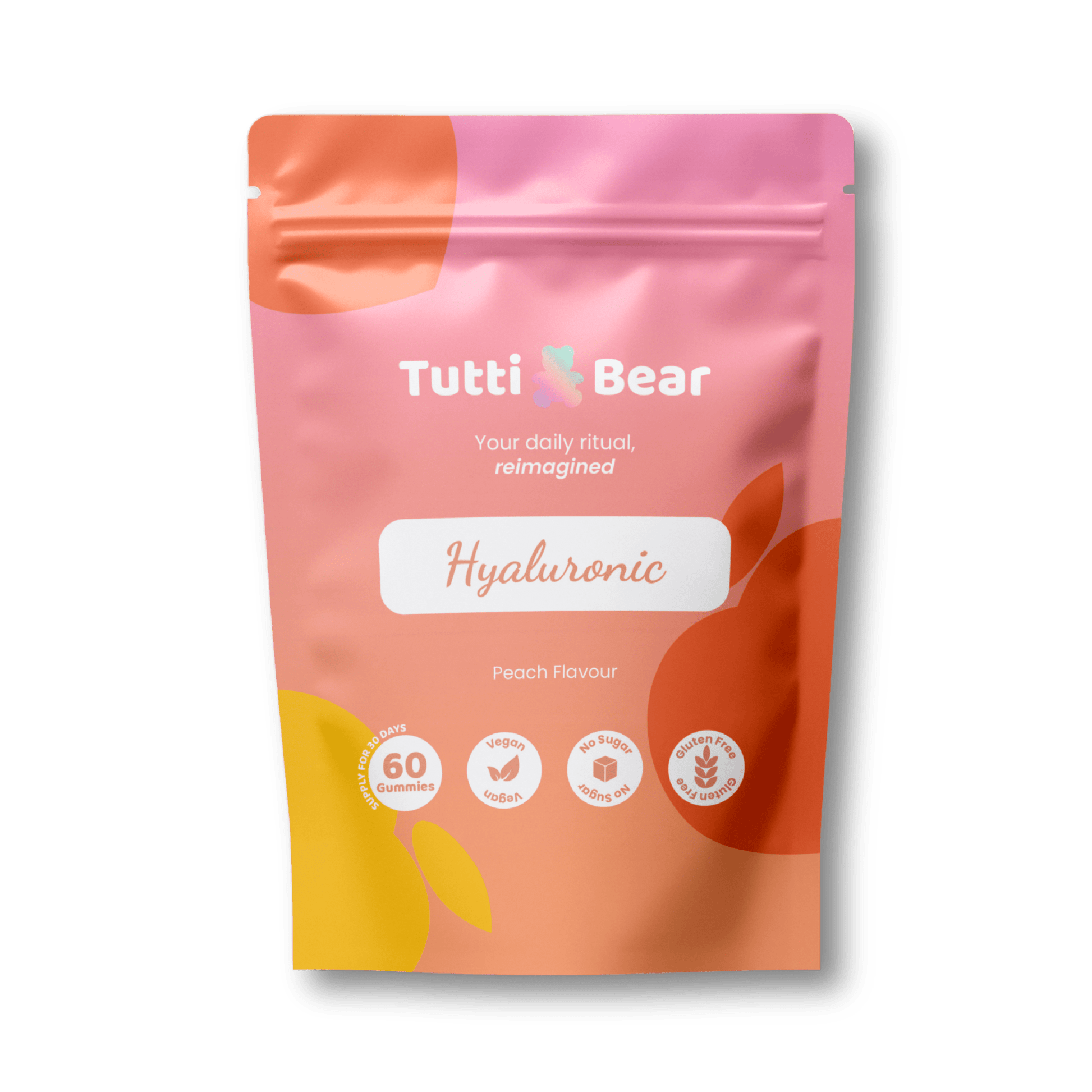 Apresentamos as Gomas de Ácido Hialurónico TuttiBear — a sua dose diária de hidratação profunda. Captámos o poder de retenção de água do Ácido Hialurónico e combinámo-lo com Vitamina C e Vitamina B3, numa deliciosa goma de pêssego sem açúcar. Uma fórmula pensada para apoiar a hidratação da pele a partir do interior.