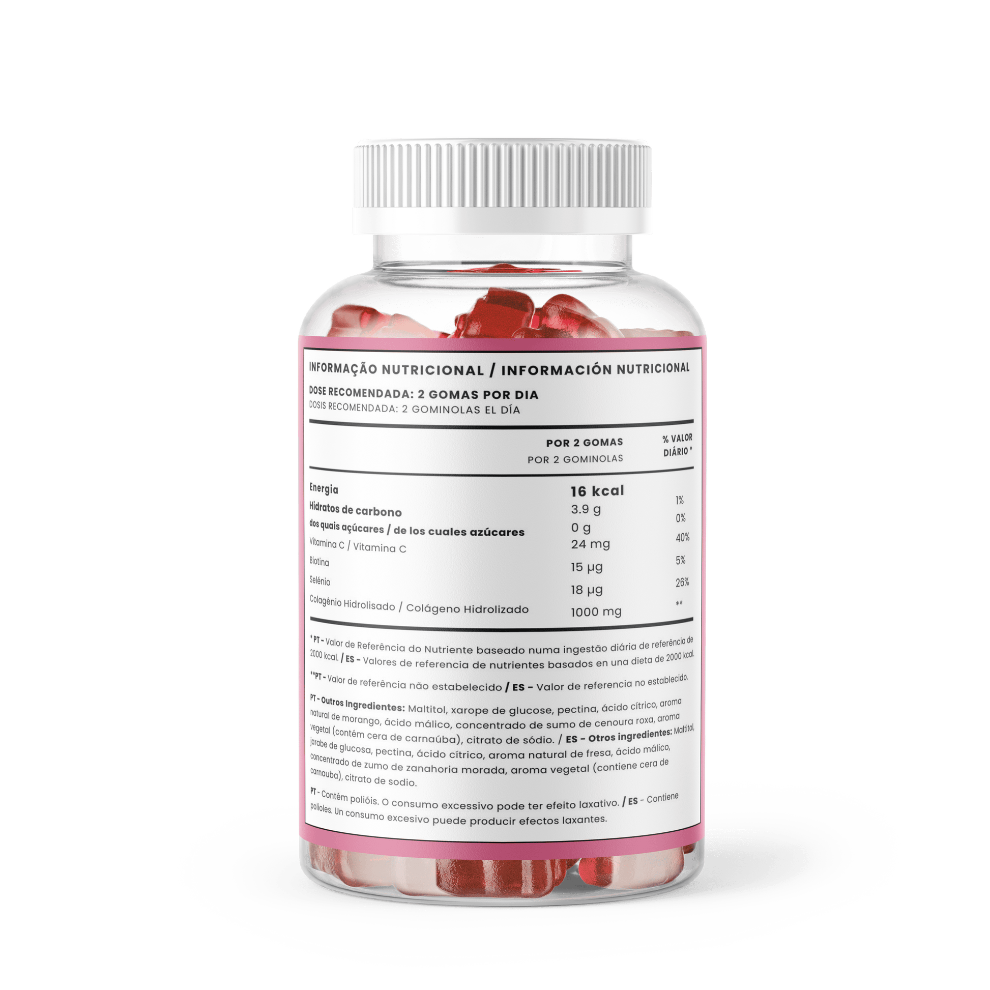 Com colagénio hidrolisado, biotina, vitamina C e selénio, estas gomas de sabor a morango ajudam a reforçar a nutrição diária para uma pele mais saudável, cabelo forte e unhas resistentes.
